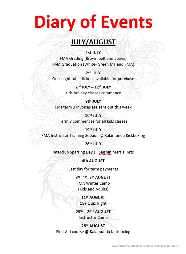 Diary of Events for July – August